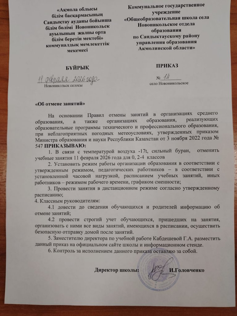 №14 БҰЙРЫҚ 2026 жылғы 11 ақпанда 0, 2–4 сынып оқушылары үшін оқу сабақтары тоқтатылсын.
