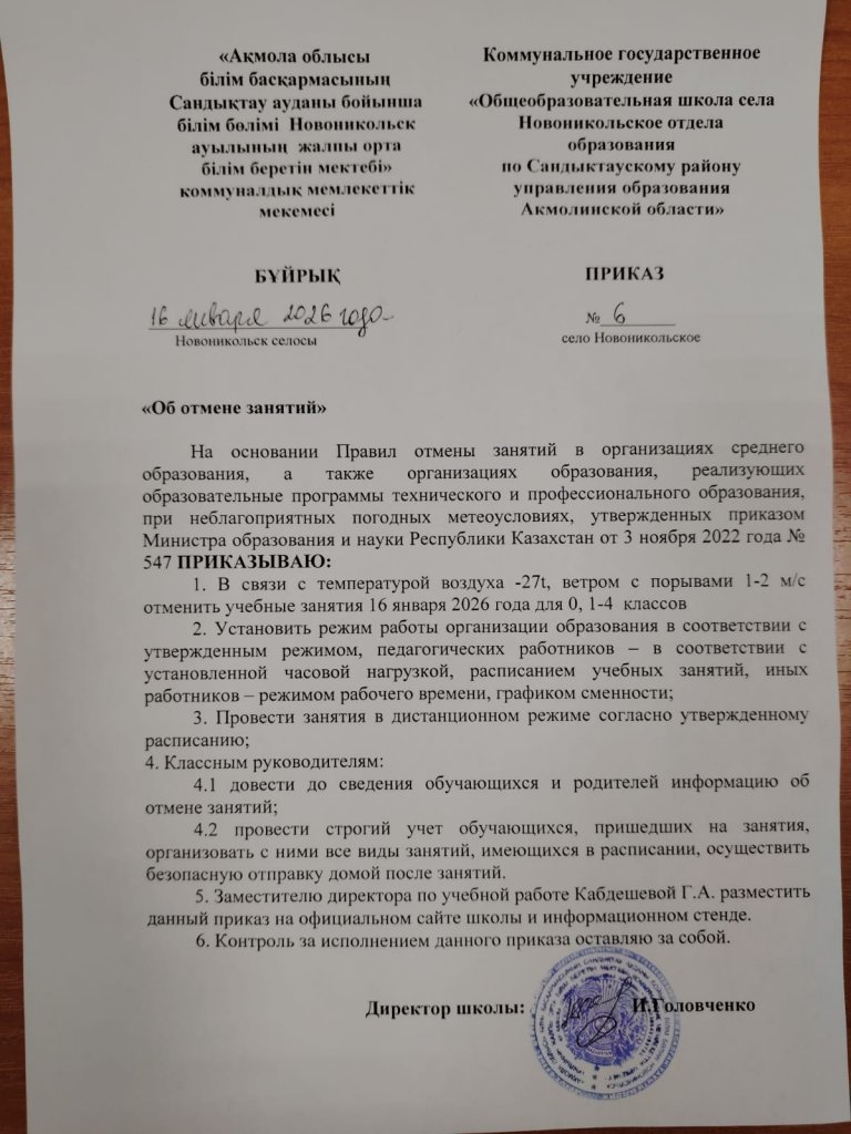 Приказ №6 от 16 января 2026 года об отмене занятий с 0,1-4 классов