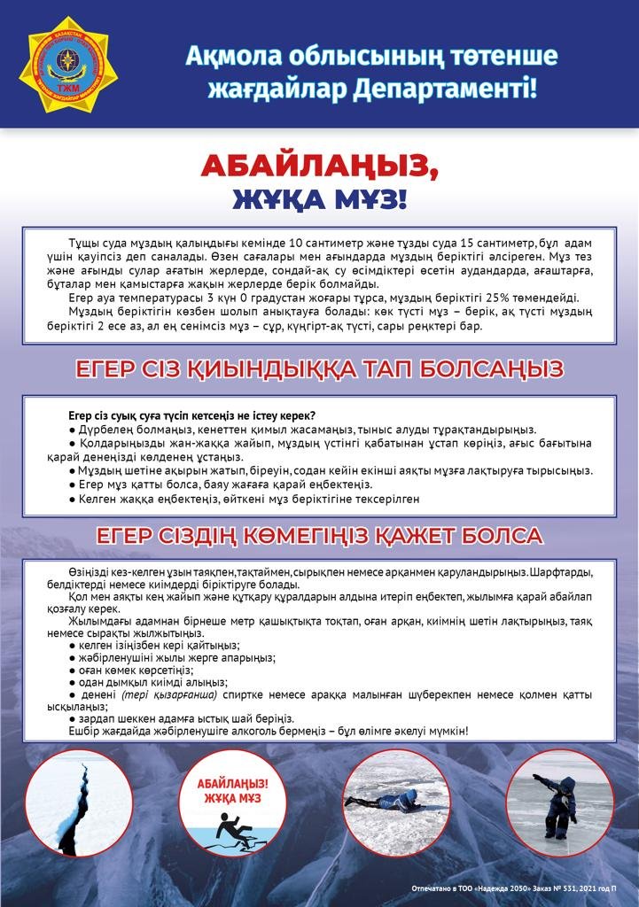 Көктем мезгілі келгенде су айдындарындағы мұз жұқарып, өте қауіпті бола бастайды. Осы кезеңде қауіпсіздік ережелерін сақтау өте маңызды.